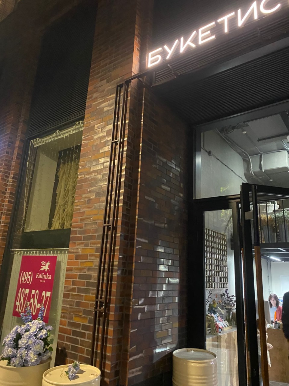 На встрече с клиентом уточнили размеры места установки, бюджет и требования к типу и дизайну объемных букв с комбинированной подсветкой. Вывеска «БУКЕТИСТ» выполнена в современном стиле с использованием объемных букв и комбинированной подсветки. Буквы имеют четкую геометрическую форму, что подчеркивает их объемность. Подсветка реализована с использованием светодиодов, которые создают эффект свечения как лицевой части букв, так и их боковых граней. Это делает вывеску яркой и заметной как днем, так и ночью.